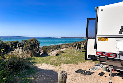 We prefer to have lunch out and eat something light for dinner so that we aren’t going to bed on a full stomach. So, we decided to head over to the Pub in the Paddock to see what was available for lunch. Ros enjoyed her glazed pork with mash and vegetables, while I had a black Angus steak with garlic prawns. We followed this with beers and wine before returning to the van and bunkering for the afternoon as the wind and rain continued relentlessly. We were surprised that our batteries had risen to 95% given the terrible weather outside.